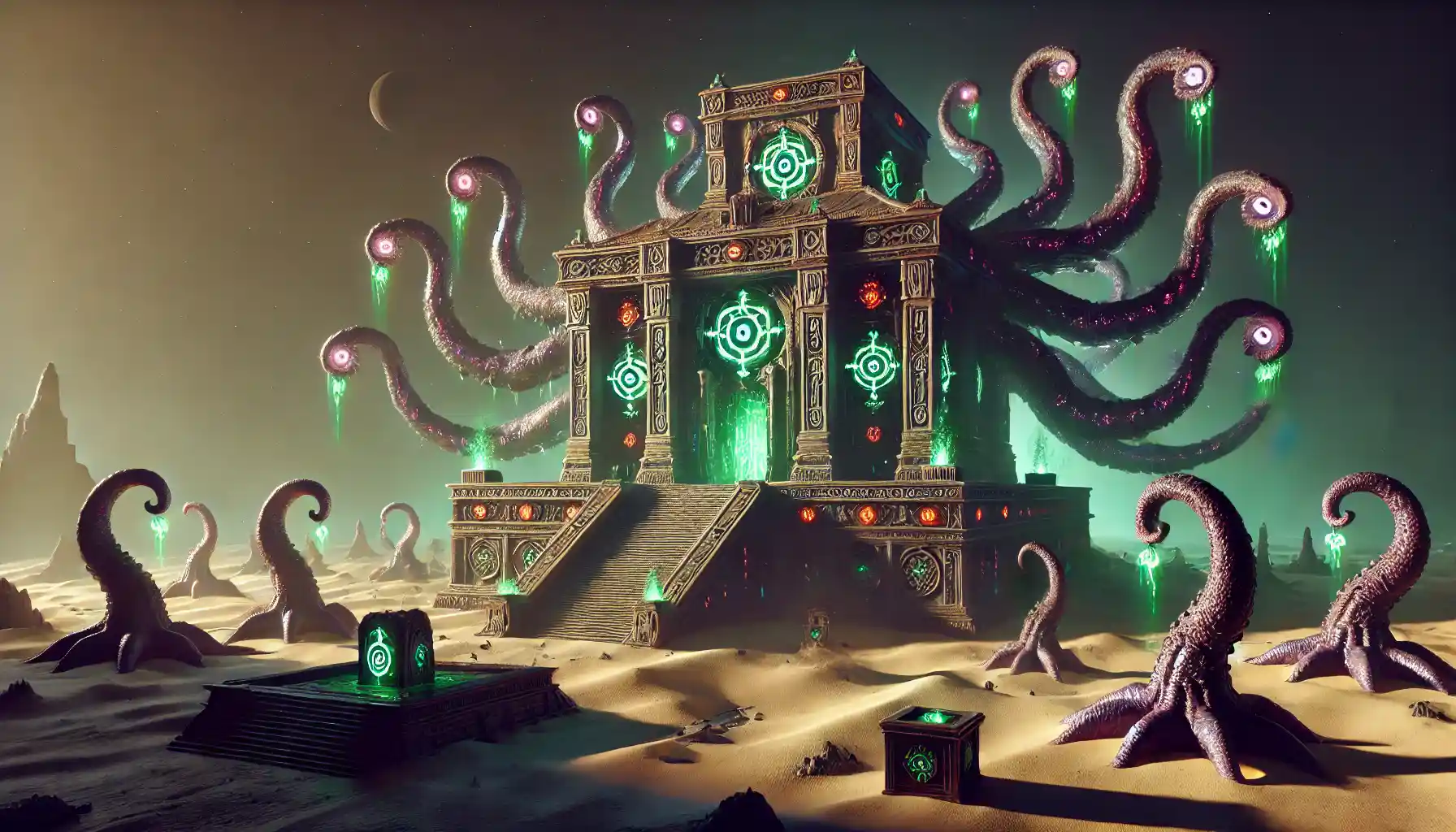 The Temple of Ahn’Qiraj, hidden in the Silithus desert, holds an ancient enemy. A long time ago, a dark power called C’Thun, an Old God, was trapped here by strong forces. C’Thun’s army, the insect-like Qiraji and Silithid, serve him and wait to spread chaos.