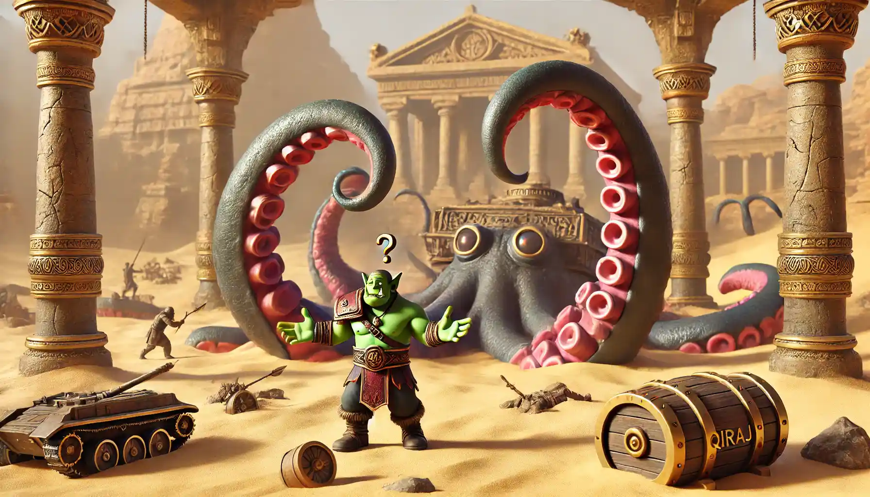 For years, the Qiraji were held behind the Scarab Wall, kept back by the Shifting Sands. But as C’Thun’s power grew, the wall weakened, and the Qiraji threat returned. The Alliance and Horde worked together in the Ahn’Qiraj War Effort to gather supplies, battle the Qiraji, and open the temple gates. With the wall gone, heroes could enter the temple.